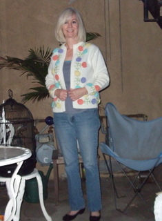 I'm severely sleep deprived and stressed out. Just normal life around this time of year. So when I finally needed to get some outside clothes on to run errands I chose this goofy old sweater. I love it. It makes me think of Gidget in those 60's movies. It's just so silly and cheerful with it's after dinner mint colored yarn flowers. I've had it for many years and someone else had it for many years before that.